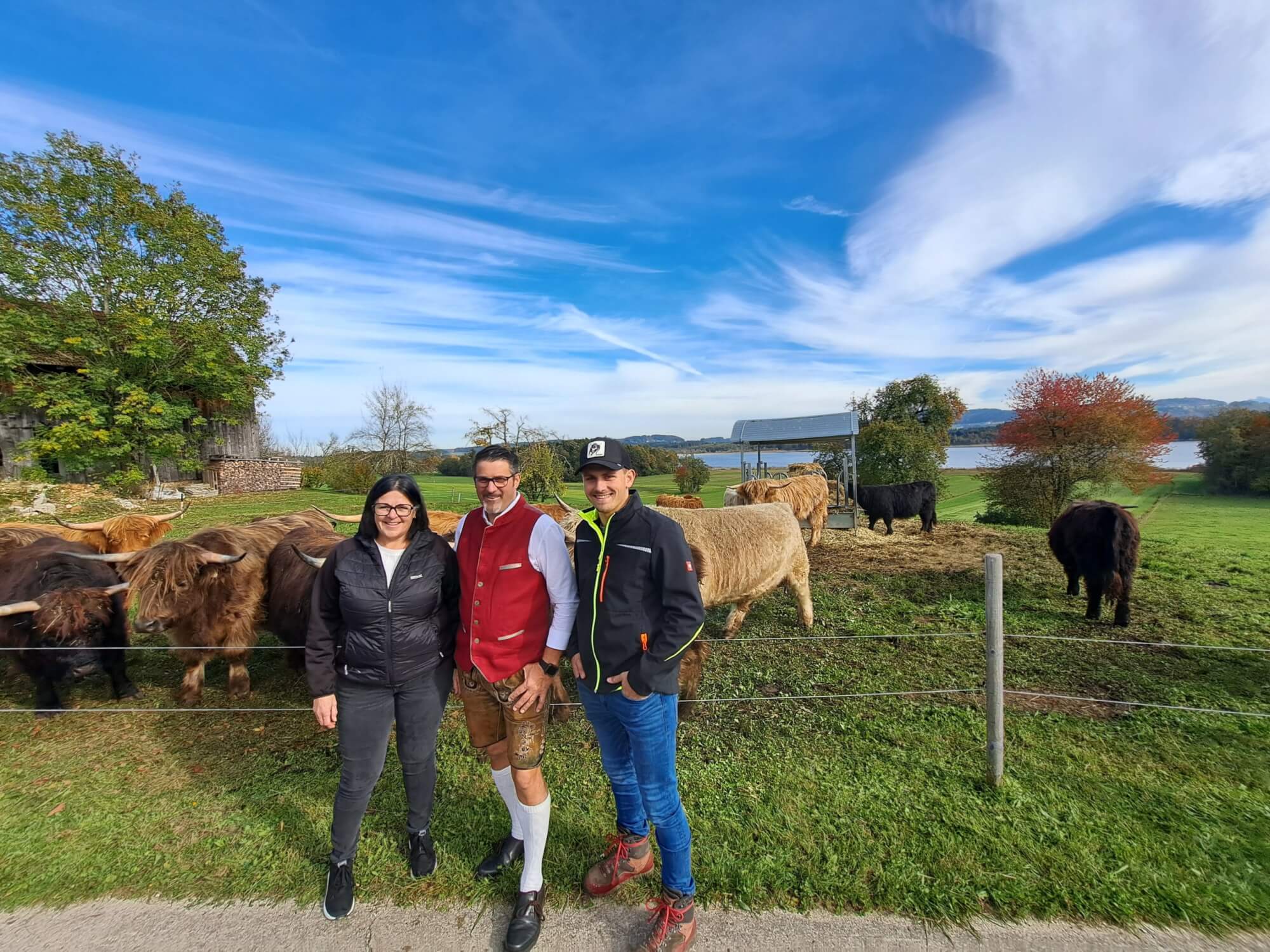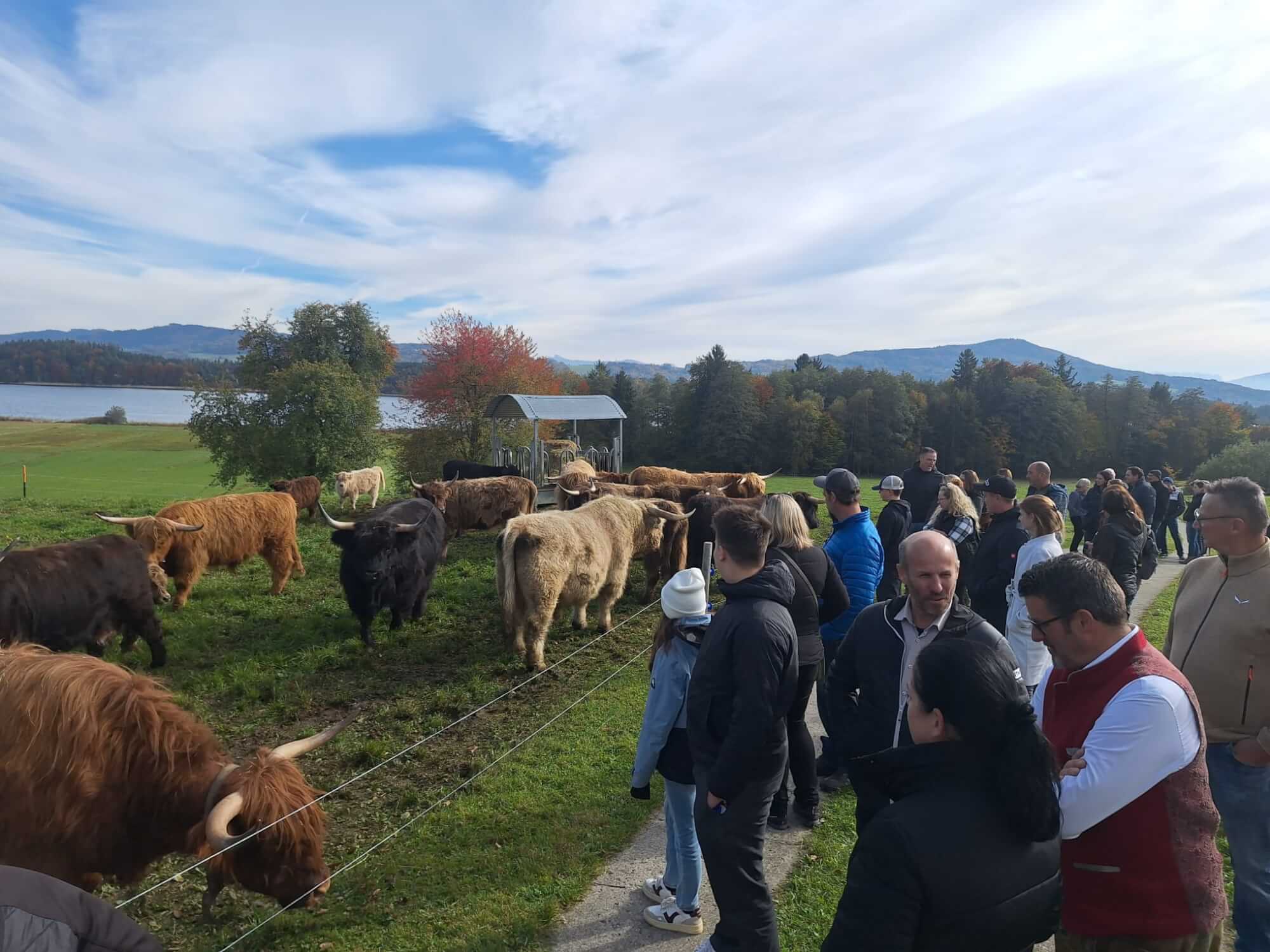 Nach einer ausgezeichneten Stärkung im Bio-Restaurant „Das Seeham“ ging es weiter zum Hubergut z’Gransdorf von Fam. Manglberger. Am Hof konnten die Züchter rund 20 Stück Hochlandrinder bestaunen. Es waren alle Fellfarben, von braun, schwarz, weiß, grau und rot, vertreten. Die Hochlandrinder genießen von April bis November eine Koppelweide mit wunderbarem Ausblick auf den angrenzenden Grabensee. Am Hubergut werden 1–2 Mal im Jahr Bio-Highlandbeef-Fleischpakete sowie Würste und diverse Edelteile direkt ab Hof vermarktet.