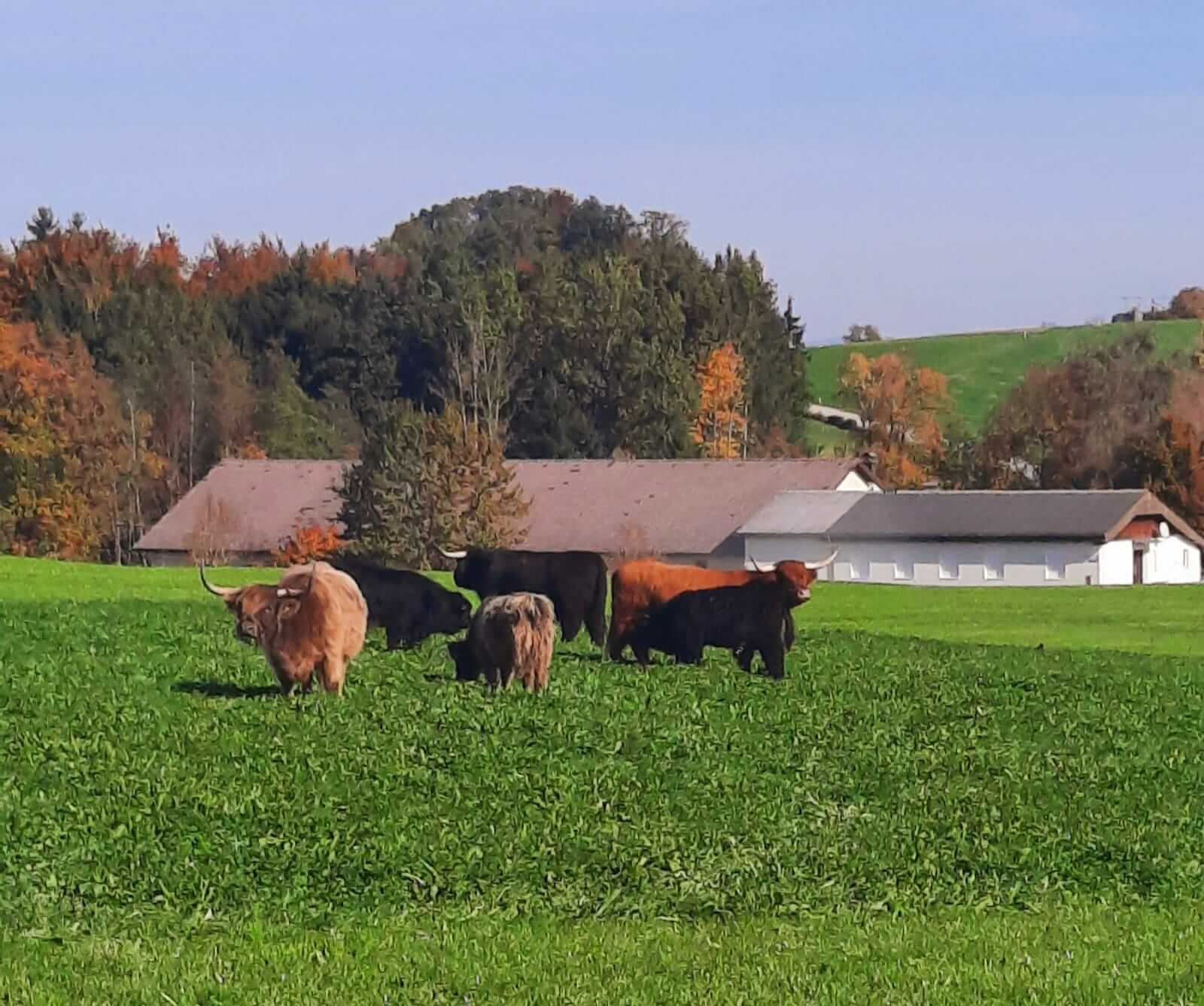 Der Schwerpunkt ihrer Landwirtschaft liegt in der Stiermast, doch auch eine kleine Herde Hochlandrinder hat bei ihnen ein Zuhause gefunden. Die Tiere genießen dort ein wahres Paradies mit saftigen Weiden und werden vorzüglich betreut.