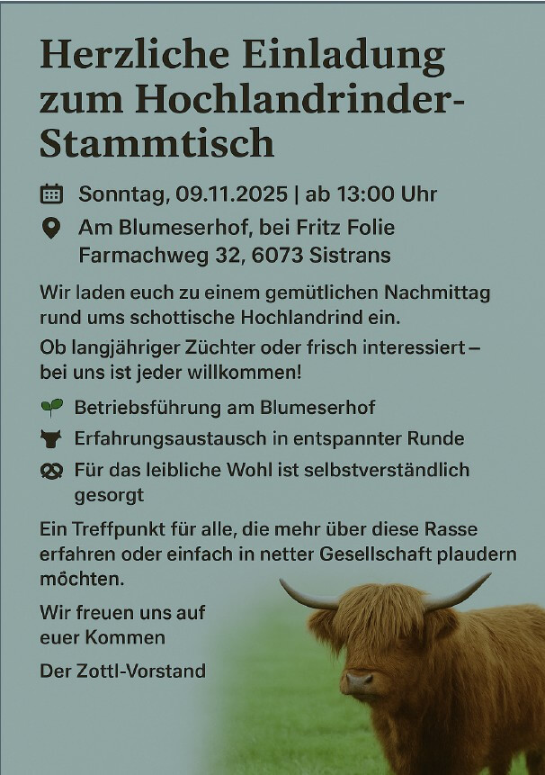 Am 9. November findet nun der Hochlandrinderstammtisch statt, den wir leider aufgrund der MKS-Situation im April verschieben mussten. Auf viele Teilnehmer freuen sich die Veranstalter und vor allem das Team vom Blumeserhof rund um Fritz Folie.